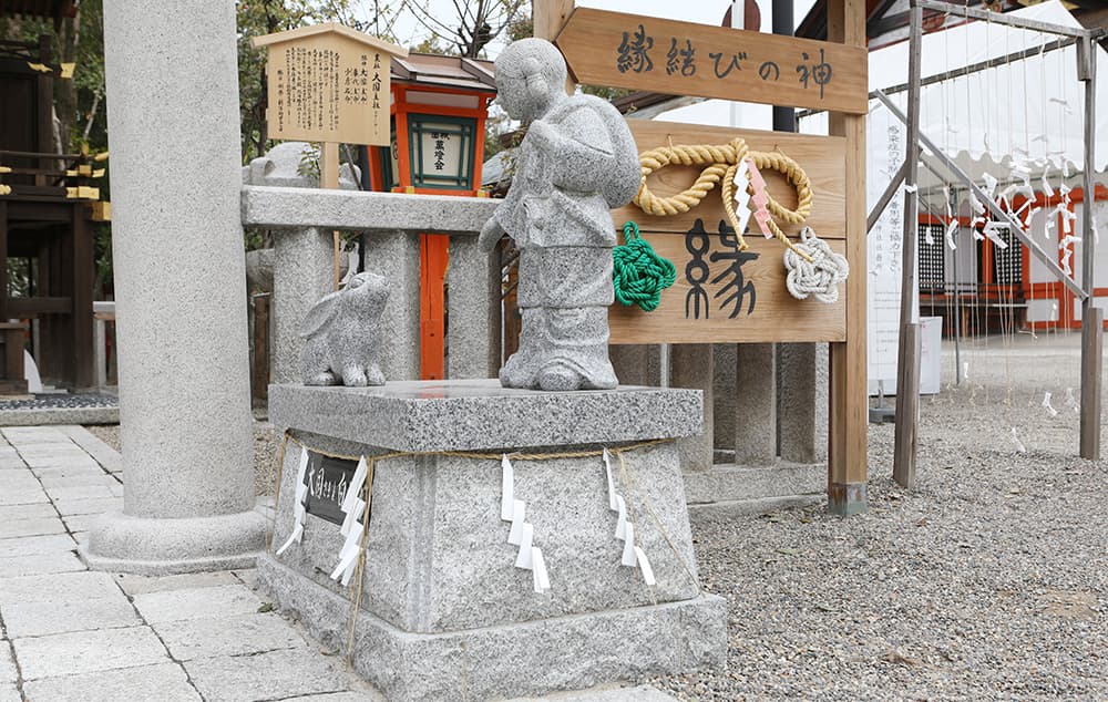 日本神話「因幡の白兎」で大国主社の御祭神であります大国主神がウサギを助ける場面を模した石像です。