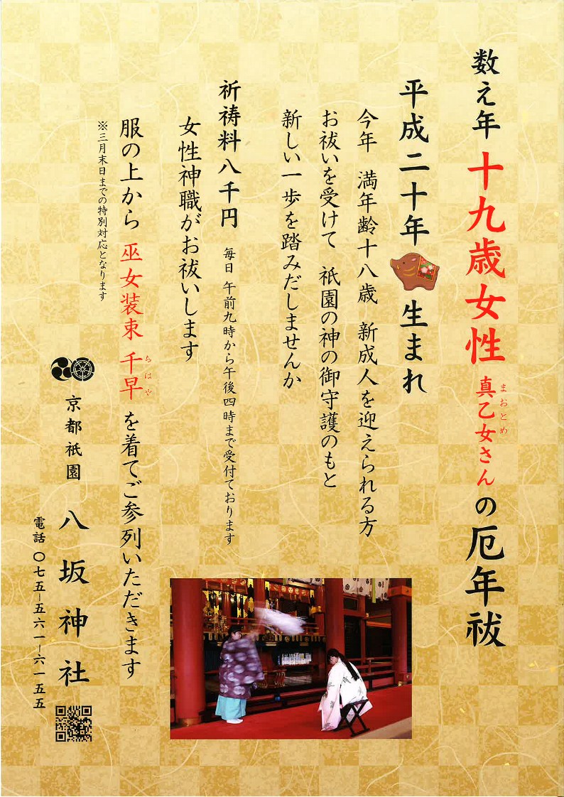 上記の通り、数え年19歳の厄年女性を対象とした厄除祈祷を行います。